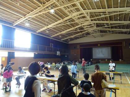 講堂に集合し受付を済ませた子どもたちは、保護者の方の隣で静かに座って説明を聞いていました。