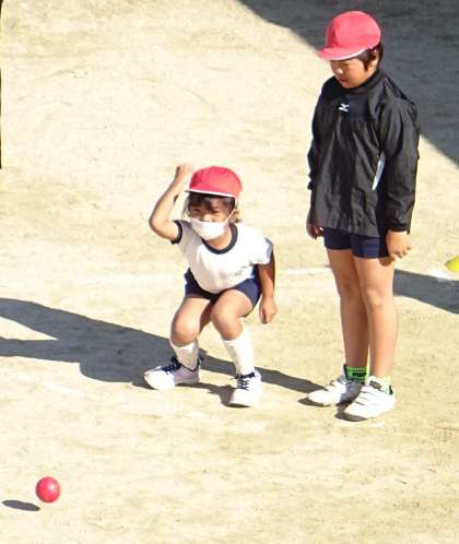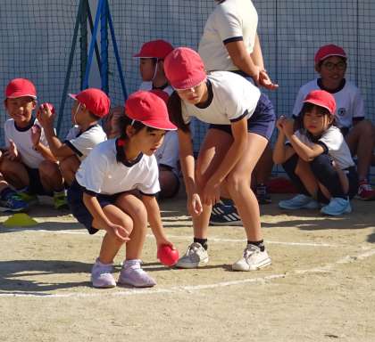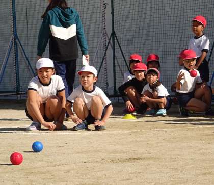 目標となる白いボールに、自分たちの色ボール(赤・青)を次々と転がし、最後に一番近くにあった色のチームが勝ちです。