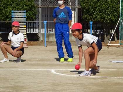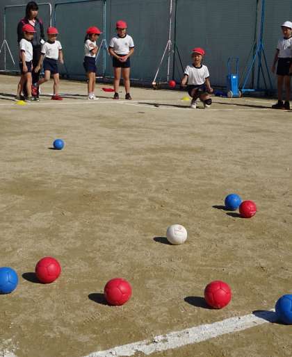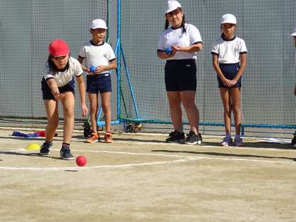 「ボッチャ」という的あてゲームをしている様子です。