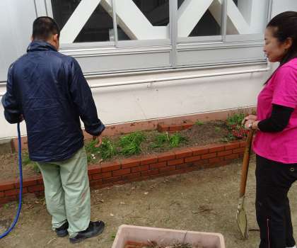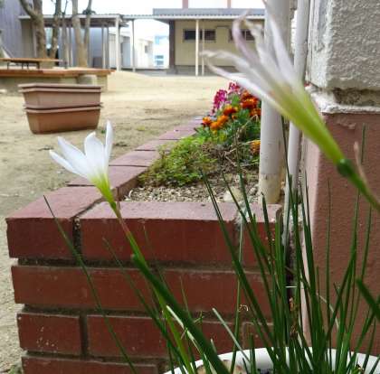 お花は、校舎横の花壇と池のそばに植え替えられました。