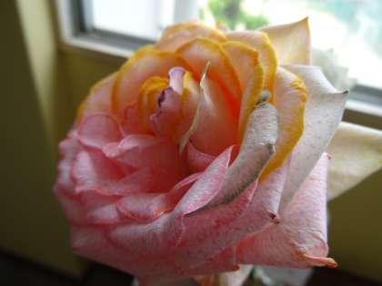 以前、理科室前の実験コーナーで展示していたバラの花「レインボーローズ」です。