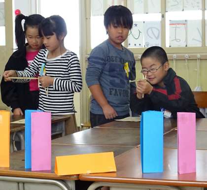 3年生「ゴムの伸び方と力」の様子です。
