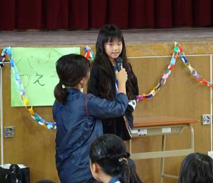 各学年の代表児童が、閉会式でふれあい学習交流会についての感想を発表している様子です。