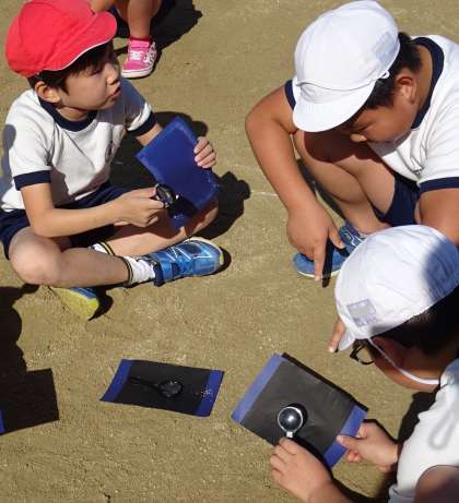 太陽の動きと影の関係について、時間を追って観察したり、太陽の光を集めて熱が発生することを確かめたりしています。