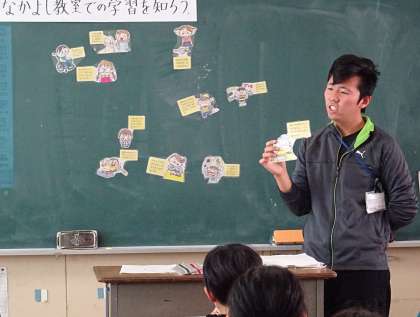 友だちが困っている場面で、どのようにすればいいのかをグループで話し合い、声掛けの仕方や約束の方法など、具体的なかかわり方を発表していました。