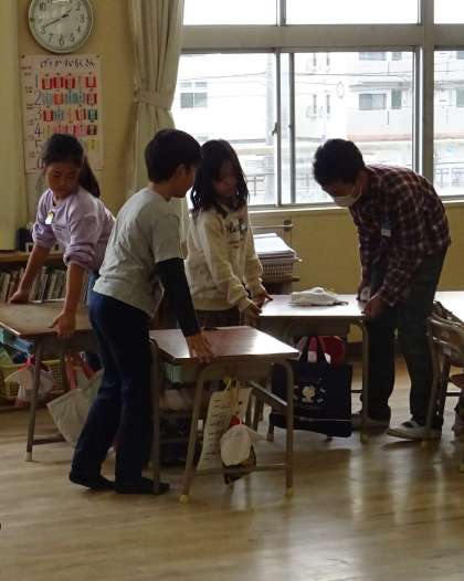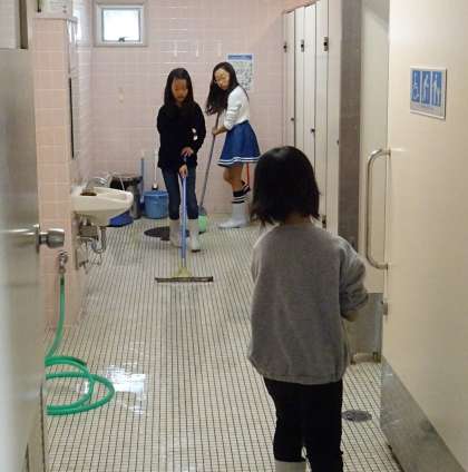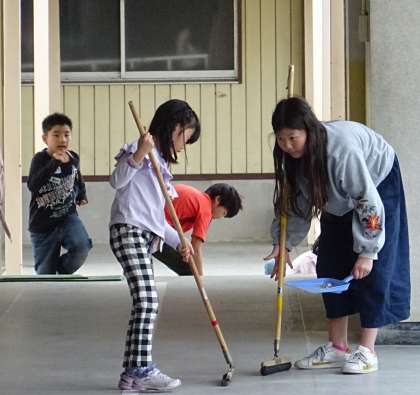 たてわり班のメンバーが協力して、学校中を美しくし掃除している様子です。