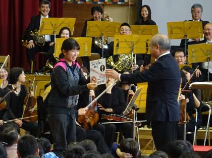 大正解の賞品として、オーケストラが演奏してくださった「ニコニコ大好き加美東」と「校歌」のCDをプレゼントしてくれました。
