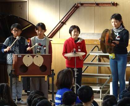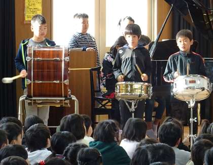 大太鼓や小太鼓、シンバルやトライアングルなどの楽器を演奏している様子です。