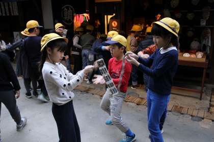 江戸時代の大阪の町並みを再現したところでは、昔の人の暮らしについてお話を聞いたり、おもちゃで遊んだりしました。