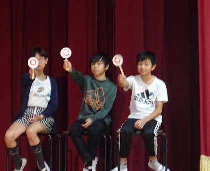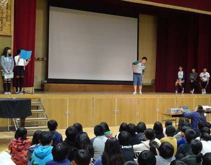 さっそく、保健美化委員会の子どもたちによる劇「アイドルオーディション 合格のために」が始まりました。