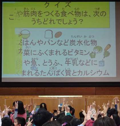 クイズのコーナーでは、骨や筋肉を作る食べ物として、たんぱく質やカルシウムが必要であることも学びました。