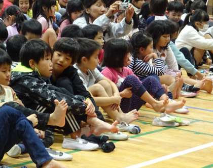 足の指を広げて、スマイル体操(良い姿勢を身につけるための運動)をしている様子です。