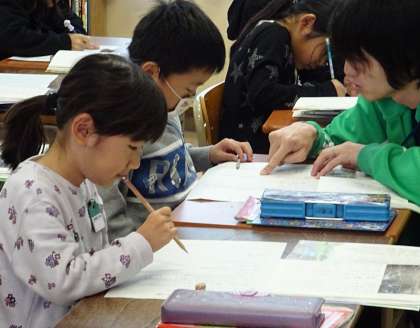 難しい課題に挑戦する時には、先生が教室中を見て回り、必要な声掛けをします。