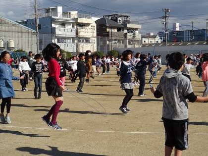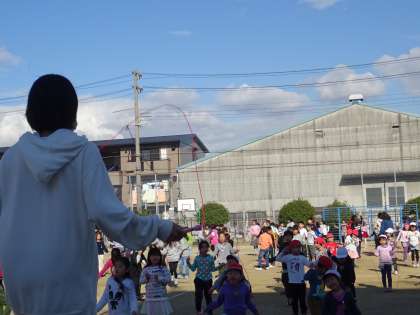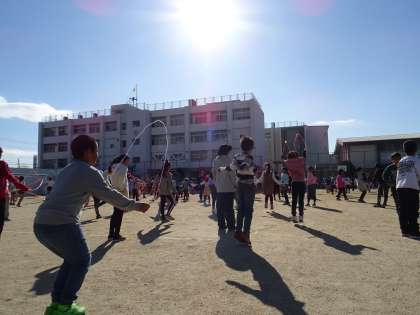 子どもたちは、雨で中止となった昨日の分まで張りきって跳んでいました。