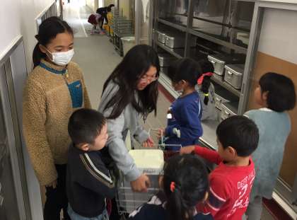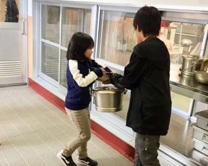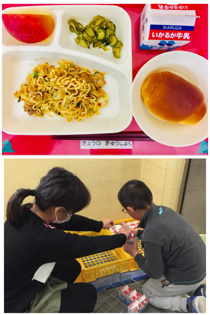 夏の暑い日も、風が強い寒い日も、給食室で全学年の牛乳パックや食器の返却を手伝ってくれています。