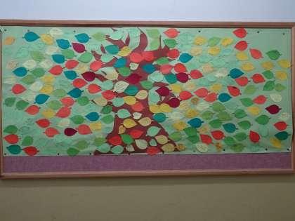 あったか言葉で埋め尽くされていく「思いやりの木」は、各学年の近くの廊下や階段の掲示板に飾られています。