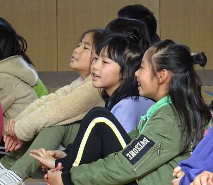 喜んで口ずさむ子どもたち。