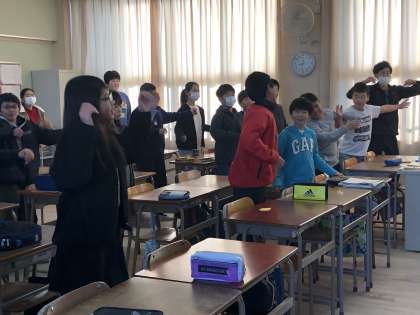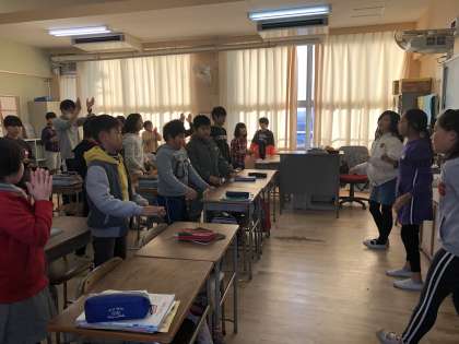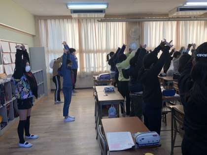 今日は、5年生の教室に保健美化委員会の児童が、「スマイル体操」を教えに行きました。さすが5年生、しっかり覚えている人も多く、ノリノリで体操をしました。みんなスマイル、今日も一日頑張るぞー!!
