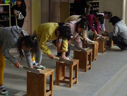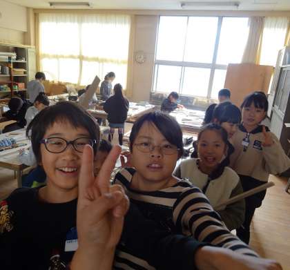 図工室の前にズラリと並んだ4年生の子どもたち。