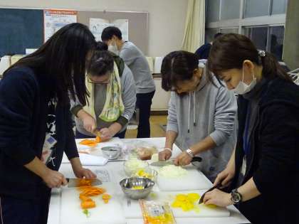この日、事前準備のために教職員が家庭科室に集まり、各国料理の下ごしらえをしていました。