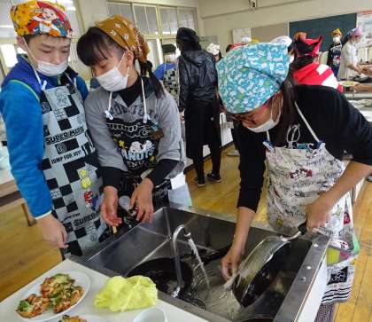 調理員さんは、加美東小学校の児童・教職員の分だけでなく、加美南中学校の生徒・教職員の分も、毎日作ってくれています。