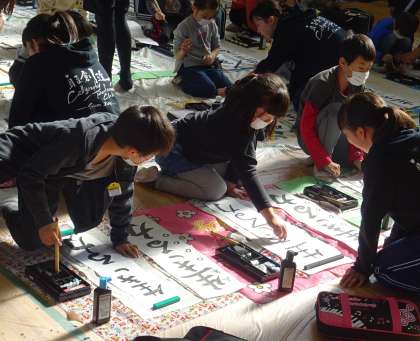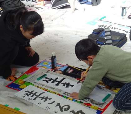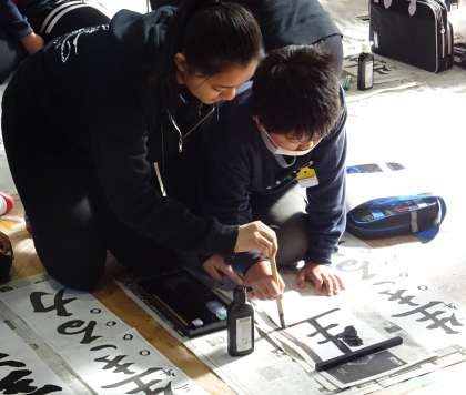上宮高校書道パフォーマンス部の皆さんは、3年生に優しく寄り添いながら教えてくれました。