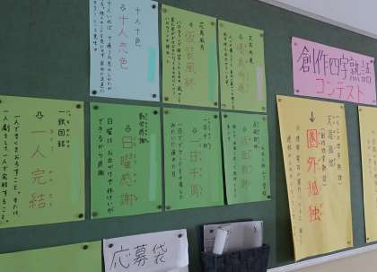 校舎4階にある掲示板には、子どもたちが考えた「創作四字熟語」が貼られています。