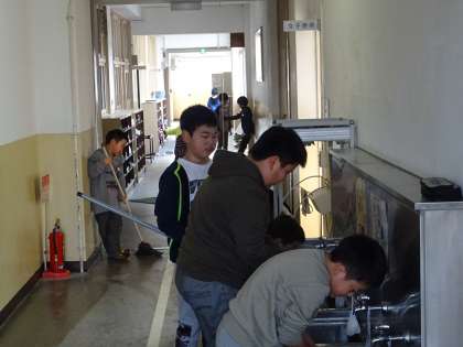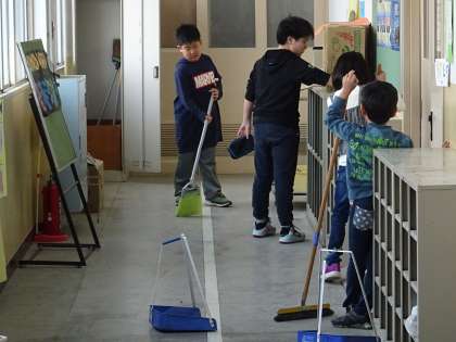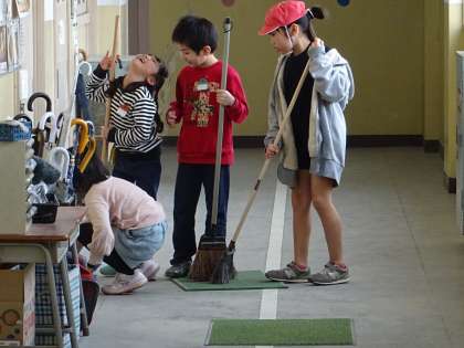 もうすぐ卒業していく6年生は、6年間で学んだ掃除の仕方と、みんなの学校をこれからも美しくしてほしいという思いを、1〜5年生の子どもたちに伝えているようでした。