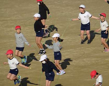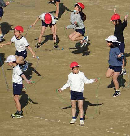 全員で準備体操をした後、運動場いっぱいに広がってなわとびをしました。