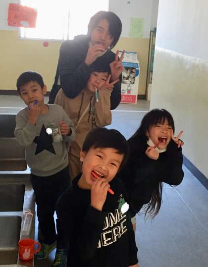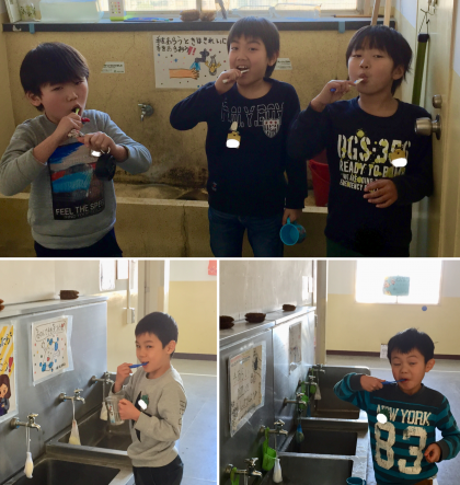 早く食べ終わった子どもたちが次々と手洗い場に集まり、歯磨きをしていました。「食べ終わったら歯を磨く習慣」が、しっかりと身についています。