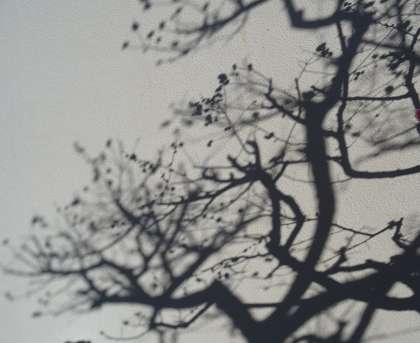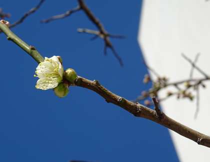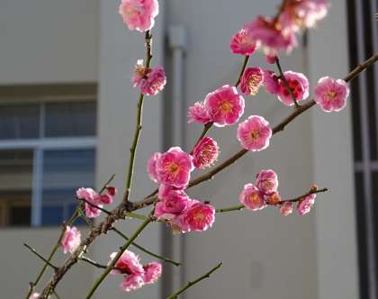 真っ白な校舎の壁に映し出された梅の影は、まるで水墨画のようですね。
