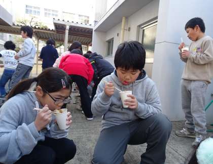 子どもたちは、お気に入りの味付けで、お餅をほおばっていました。