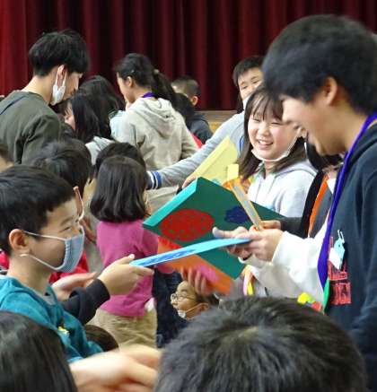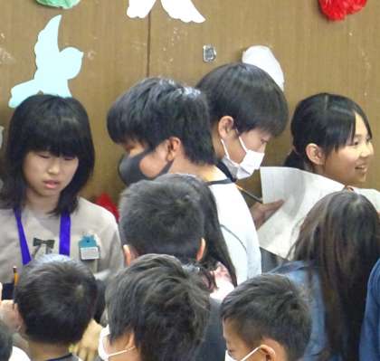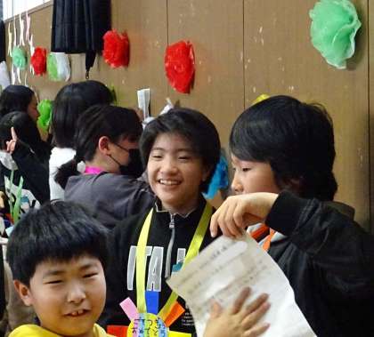 夢を書いたカードに、6年生のサインをもらって喜ぶ子どもたち。