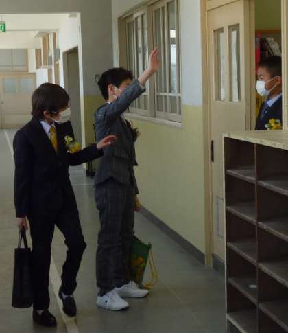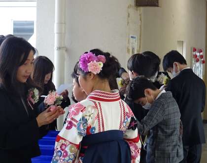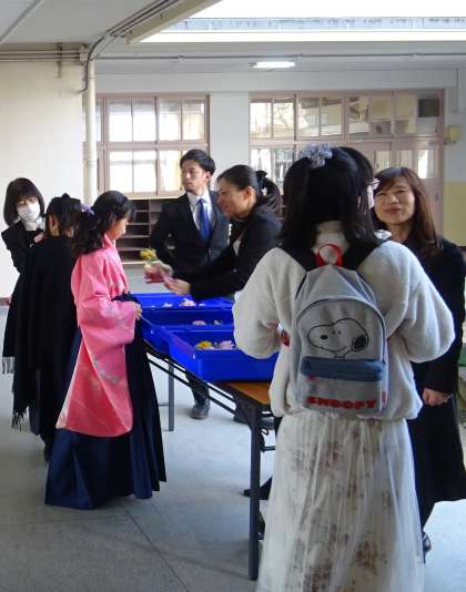 ピンクやイエローのコサージュは、PTA(6年保護者)の方による手作りです。