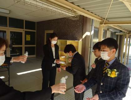 講堂の入り口では、アルコール消毒液で手を除菌しました。