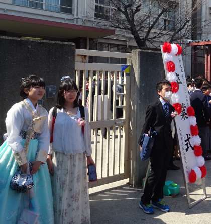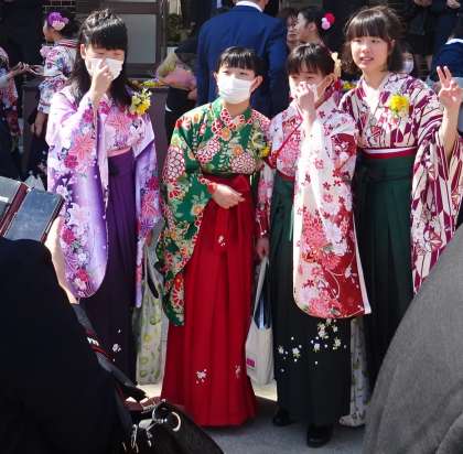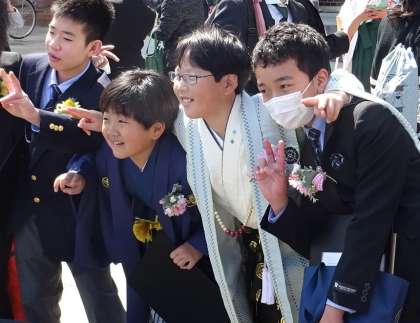 校門付近で友だちや先生と記念写真をとっている様子です。