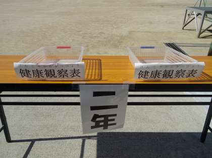 ・登校後、運動場で学年・組ごとに「健康観察表」を確認し、健康観察が済んだ児童から教室に移動します。