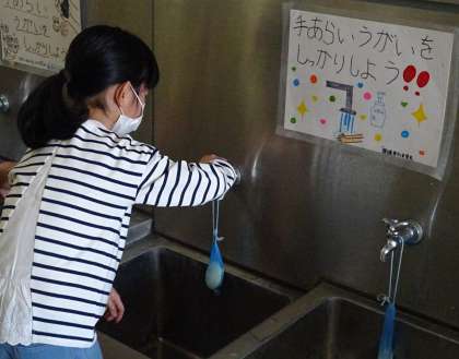 自分の席を確認しランドセルを置いたら、すぐに手を洗いに行きます。
