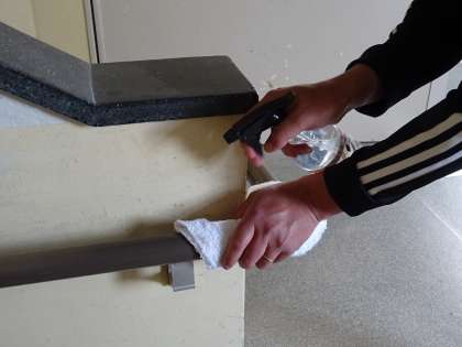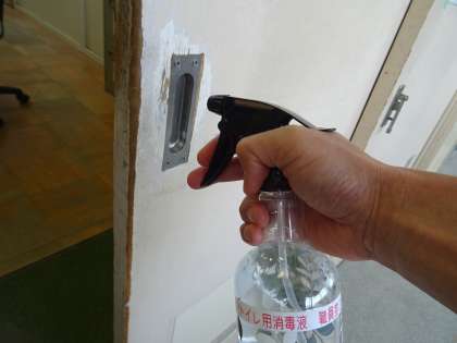 子どもたちが登校する前や入れ替わる際はもちろん、多くの人が触れる箇所(階段の手すり・ドアノブ・教室の扉付近)もこまめに消毒しています。