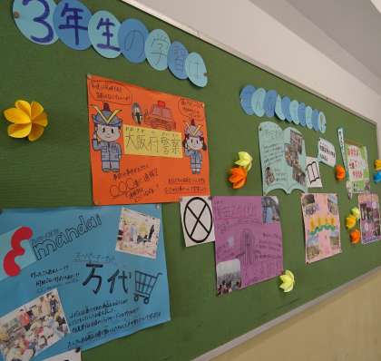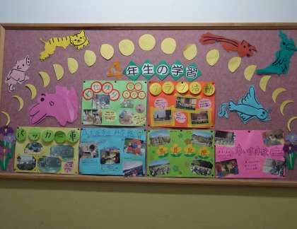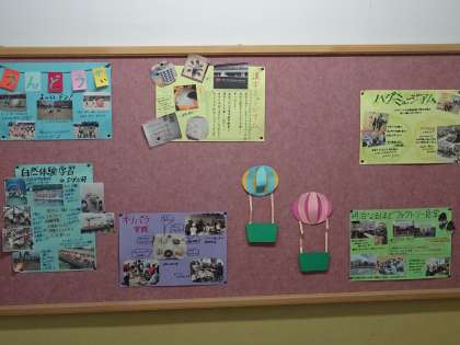 階段や廊下の掲示板には、学年で予定している年度行事などが写真付きで紹介されています。