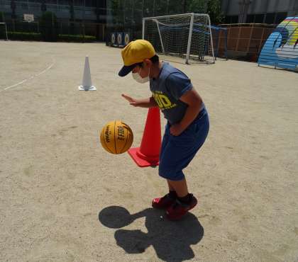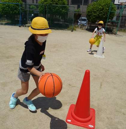 平均台、ハードル、フープ跳び、ドリブル、最後はダッシュです。