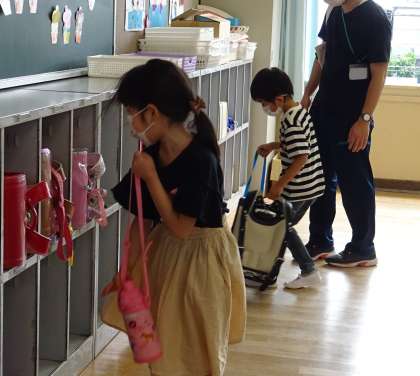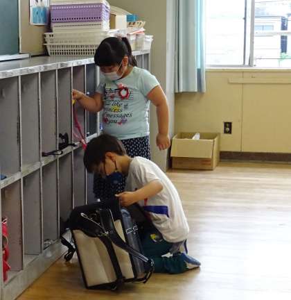 ロッカーの中に、ピカピカのランドセルを入れます。