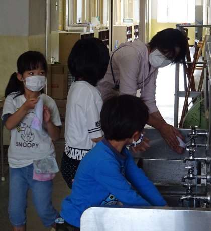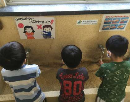子どもたちは、先生といっしょに「手洗いの歌」を歌いながら、ていねいに手を洗っていました。