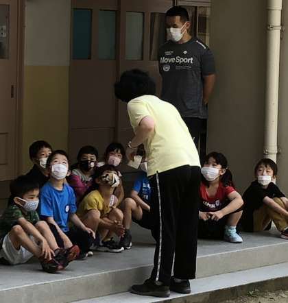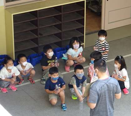 1年生が、あさがおの水やりを終え、先生の話を聞いている様子です。