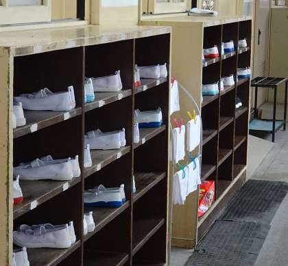 子どもたちが帰った後、1年生の下駄箱を見ると、ピッタリとそろえられた上ぐつがキレイに並んでいました。