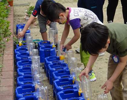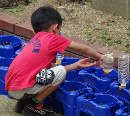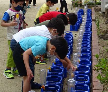 1年生が、あさがおに水やりをしている様子です。