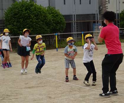 運動場で元気いっぱいに活動する子どもたちの様子です。
