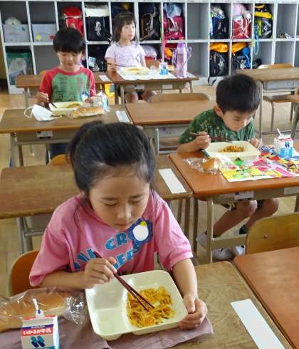 この日のメニューは、牛乳、おさつパン、スパゲッティミートソース。