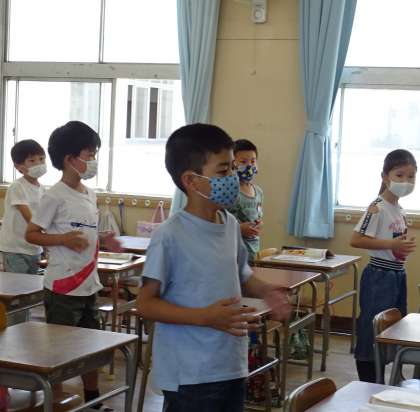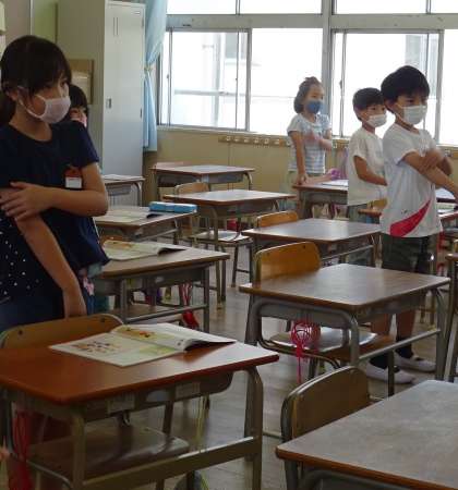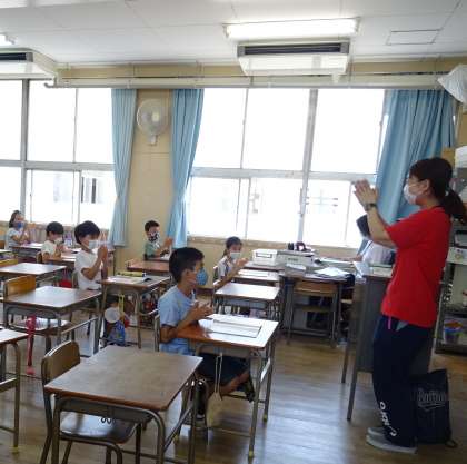 お腹や腕をたたいたり、足を踏み鳴らしたりと、感染症予防を考えた学習活動が行われています。