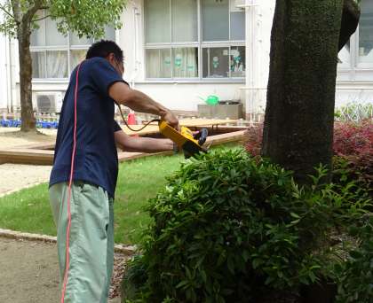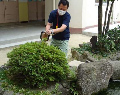 管理作業員さんが、中庭の植木を手入れしてくれています。